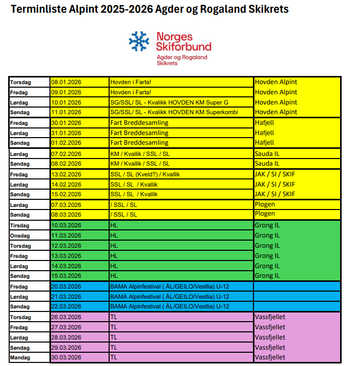 Alpinkomiteen har vedtatt terminlisten i egen krets. NB! Sjekk terminlisten for endringer.