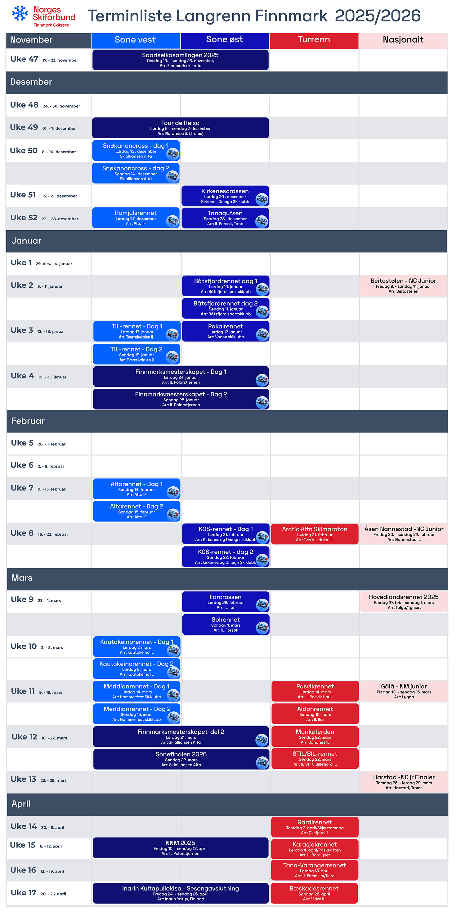 Terminlisten for langrenn i Finnmark skikrets 2025/26 er nå ferdig bearbeidet og vedtatt av langennskomiteen.