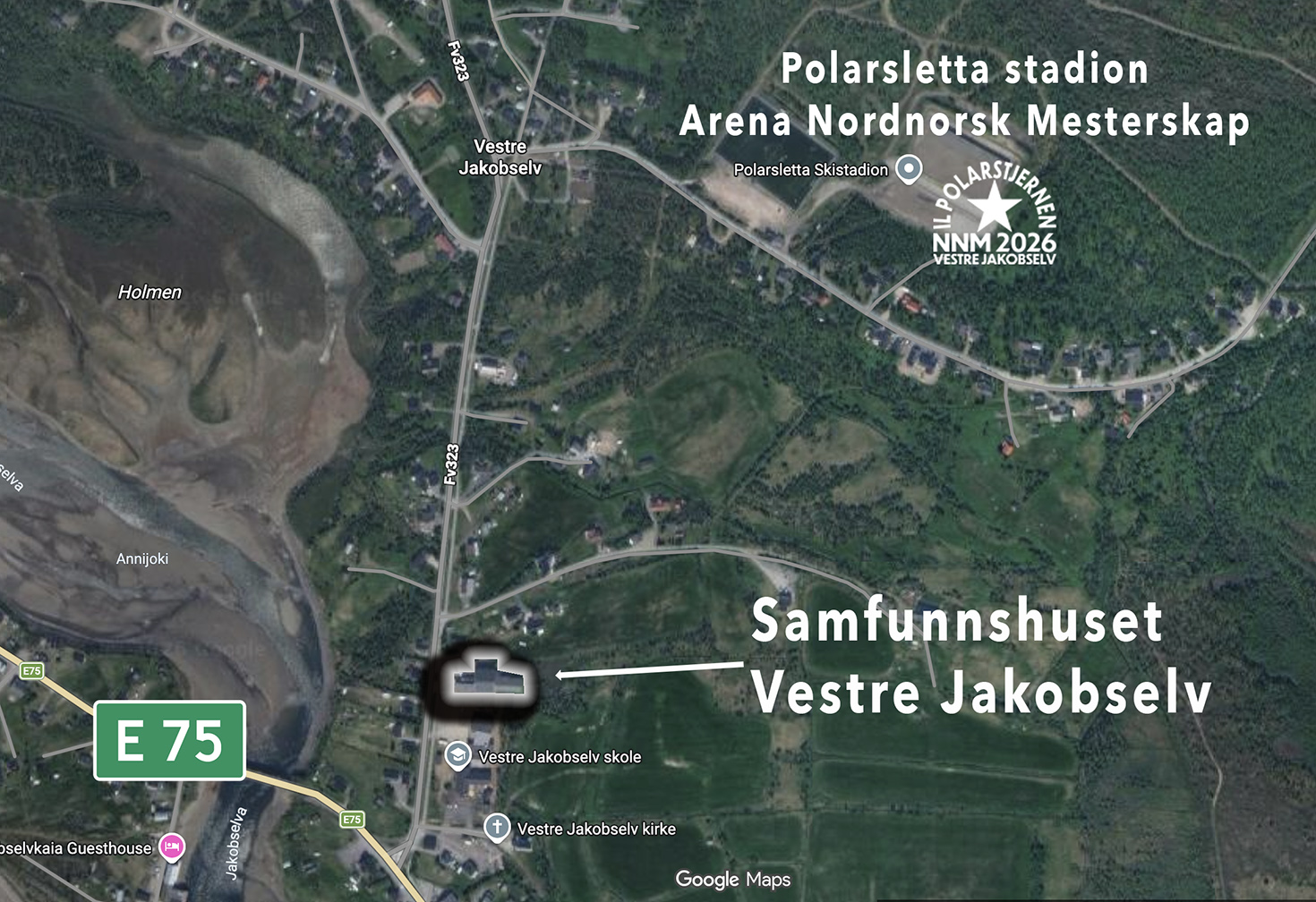 Her ligger samfunnshuset i Vestre Jakobselv. (Klikk på kartet for full størrelse)