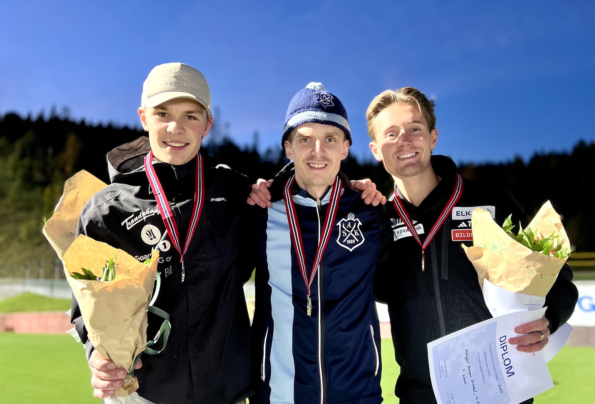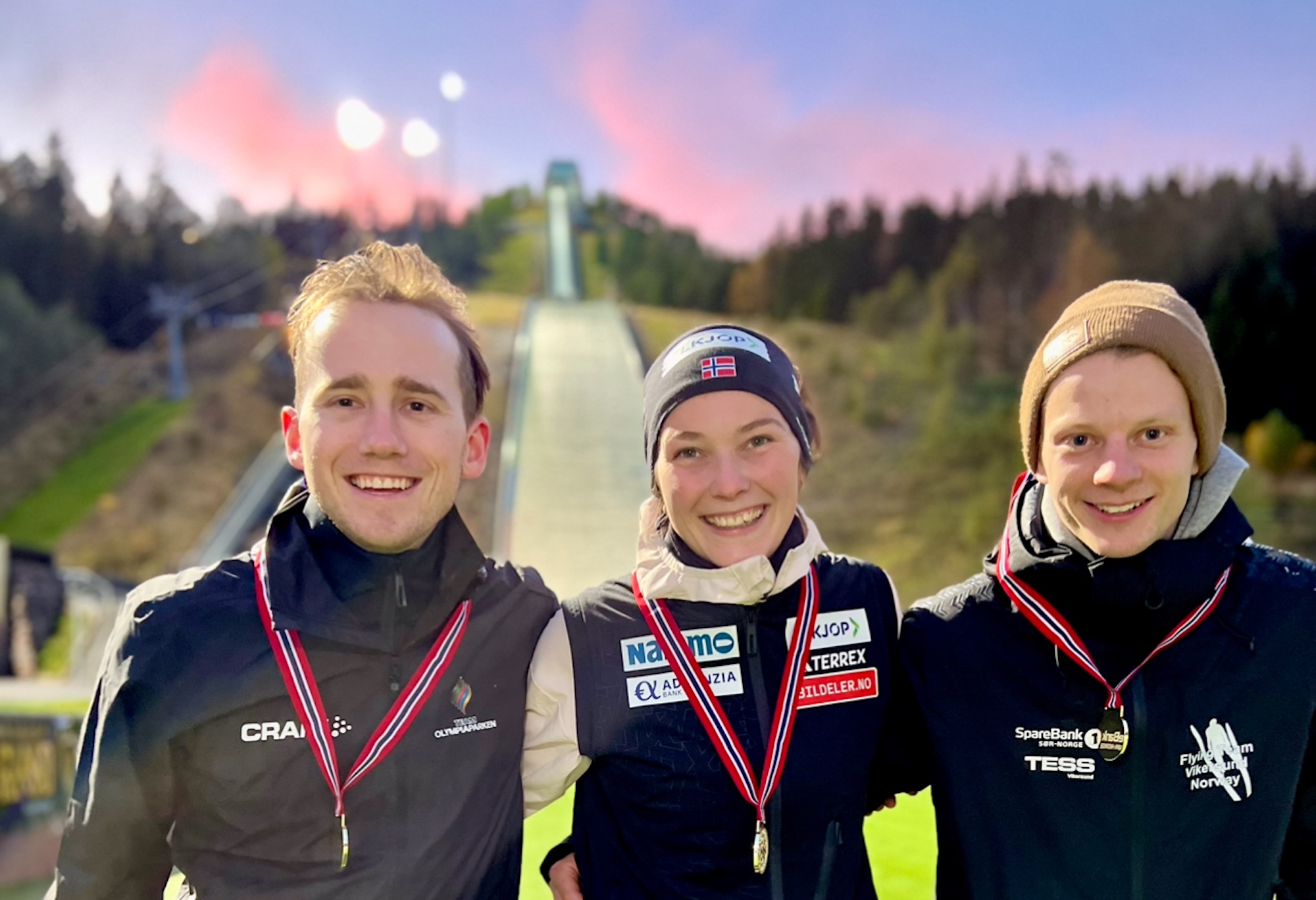 Foto: Halvor Egner Granerud vant mennenes NM-renn i normalbakken foran Isak Andreas Langmo (t.v.) og Kristoffer Eriksen Sundal.