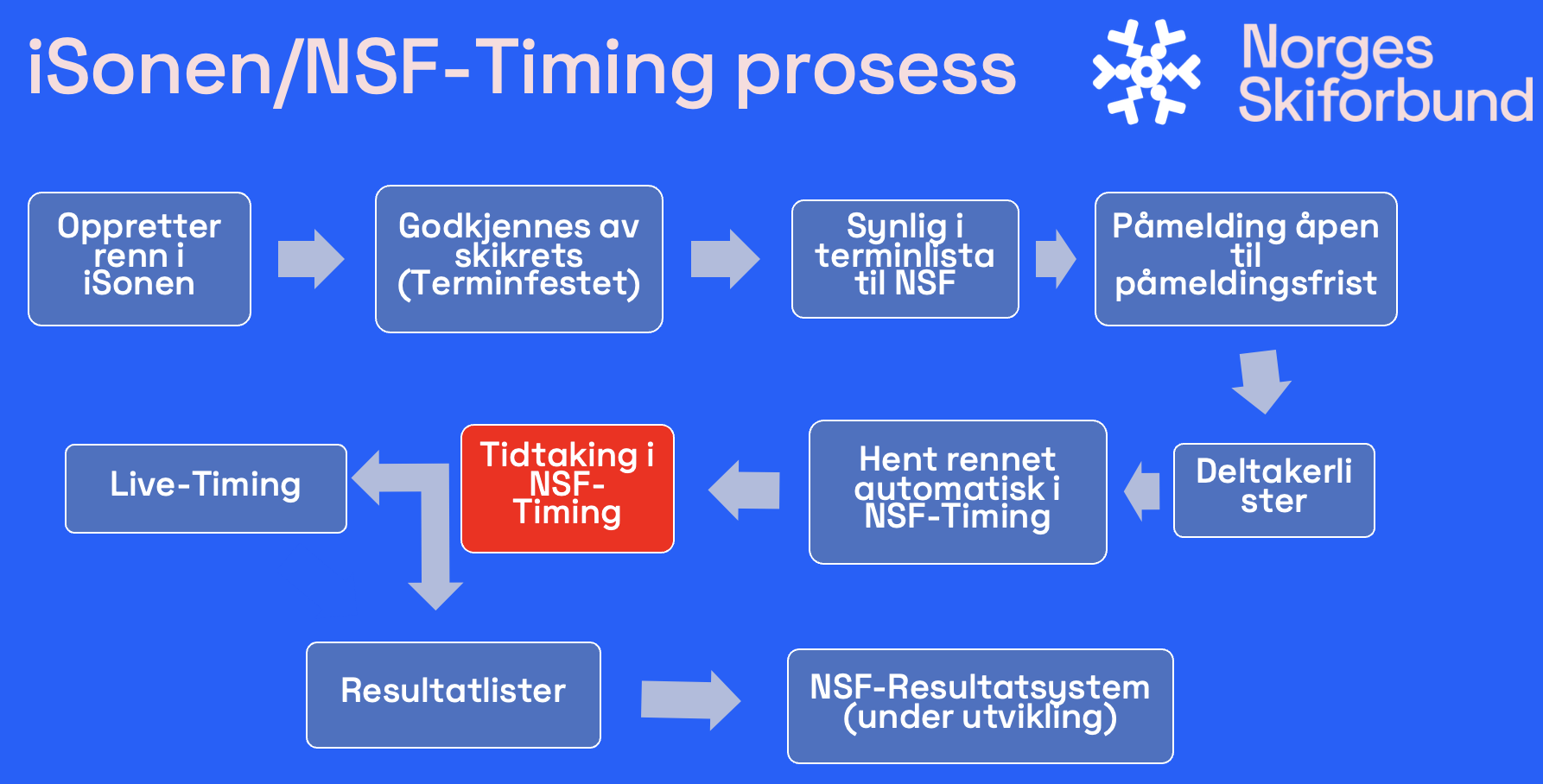 NSF-Timing er tilpasset alle konkurranseformer innen langrenn og er tett integrert med iSonen.no. Når et arrangement er opprettet i iSonen, er det klart for tidtaking i NSF-Timing.