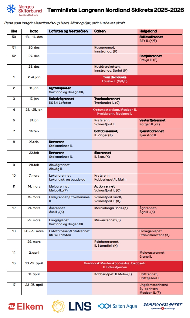 Langrennskomiteen har endret Nordlandscupen for kommende sesong med mål om å øke deltakelse på skirenn i de respektive sonene (Lofoten & Vesterålen, Salten og Helgeland). Det vil bli avholdt 6 tellende renn i cupen og de 4 beste rennene teller sammenlagt. Rennene annonseres som Nordlandscup Nord, Midt og Sør.
