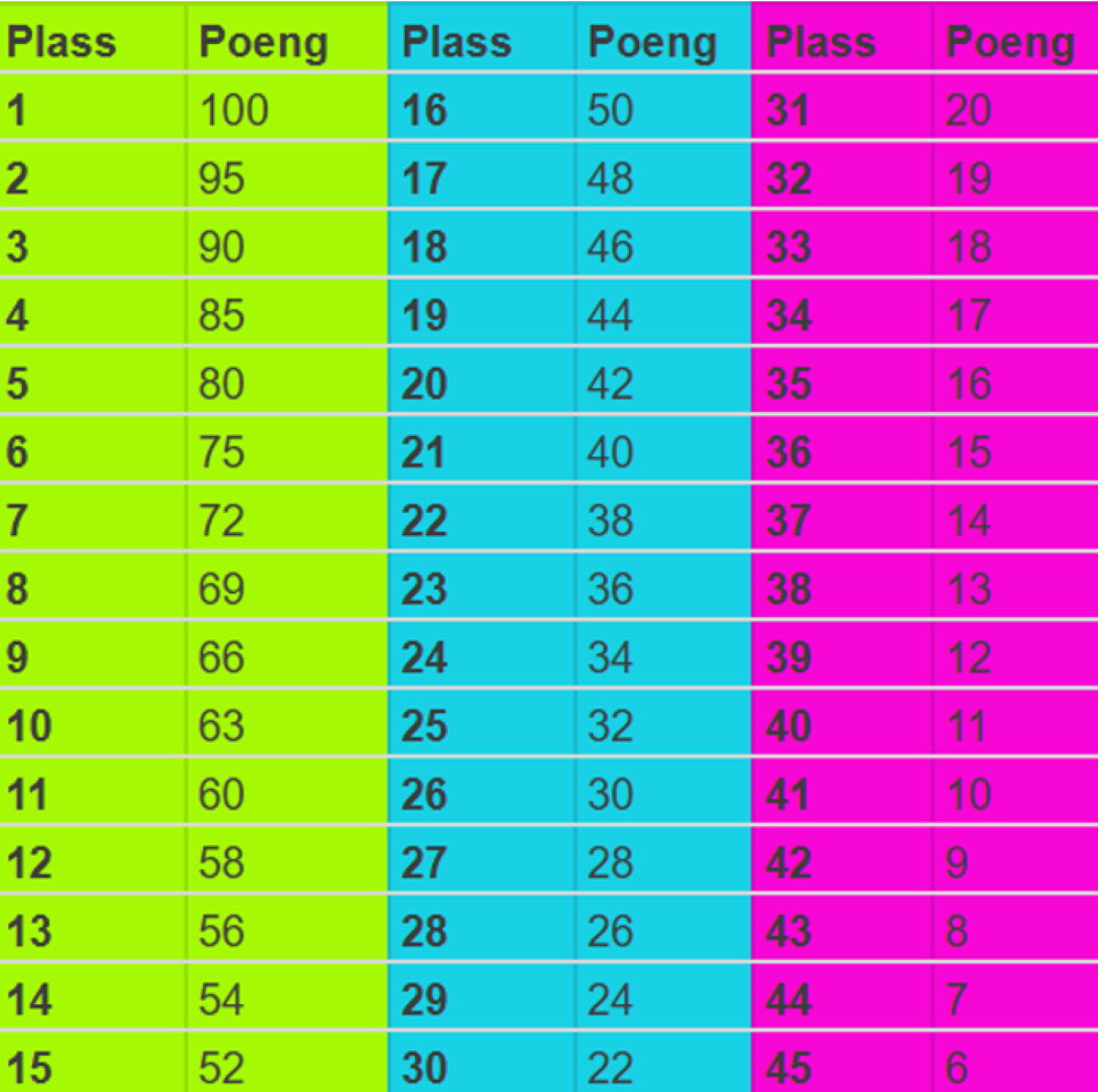 Poengfordelingen for de ulike plasseringene er i år lik fordelingen i verdenscupen: