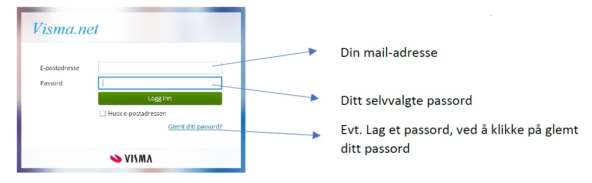 Du skal ha fått tilsendt en mail med tittelen «Velkommen til visma.net» klikk på knappen for å aktivere brukeren, da får du en ny mail hvor du får beskjed om å lage et passord. Ditt brukernavn blir din mail-adresse.