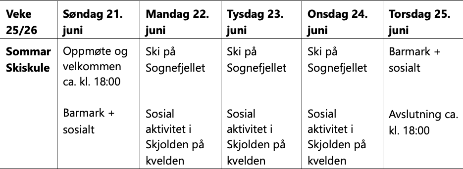 Rammeprogram for Sognefjellet sommarskiskule 21.- 25. juni 2026: